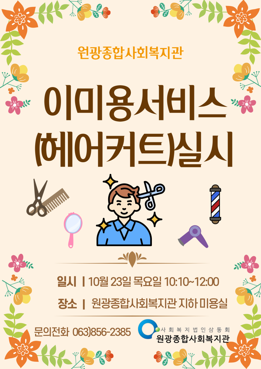 제목 [지역사회보호사업-10월 이미용 서비스 실시] 작성자 관리자 작성일 25-10-01 16:38 0건 210회 본문 10월 이미용 서비스를 실시 합니다. 가을 바람 타고 원광종합사회복지관 지하 이미용실로 헤어커트하러 오세요!! 댓글목록 목록
