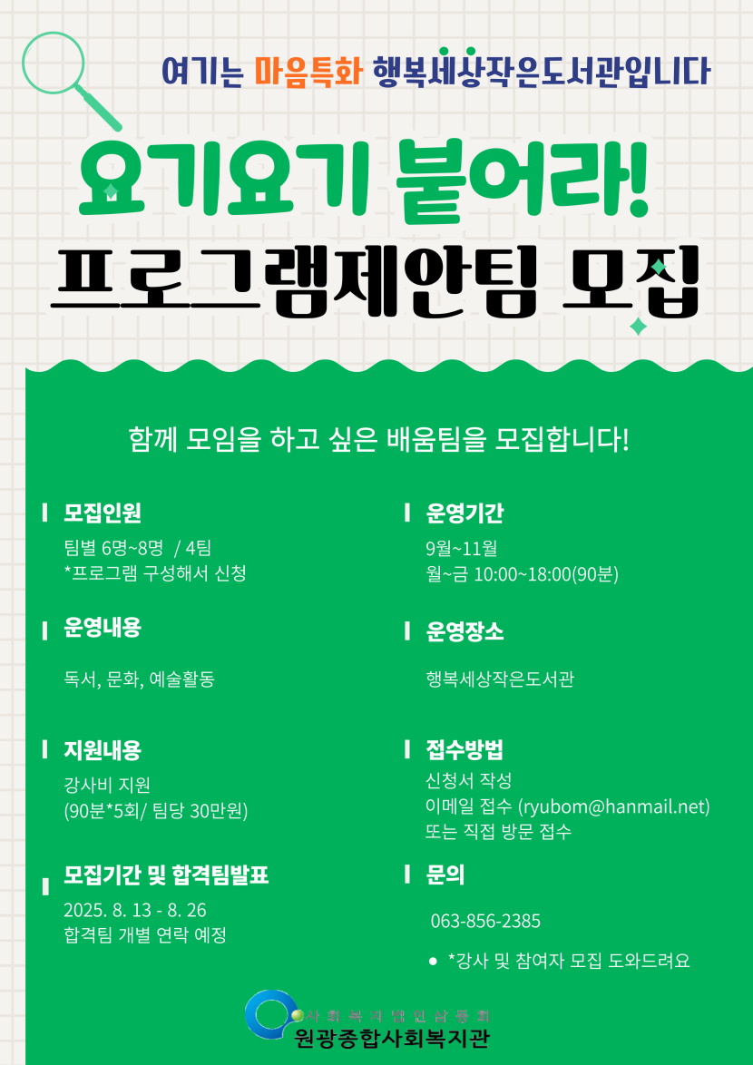 | 제목 | 행복세상작은도서관 "요기요기 붙어라" 프로그램 제안팀 모집 |